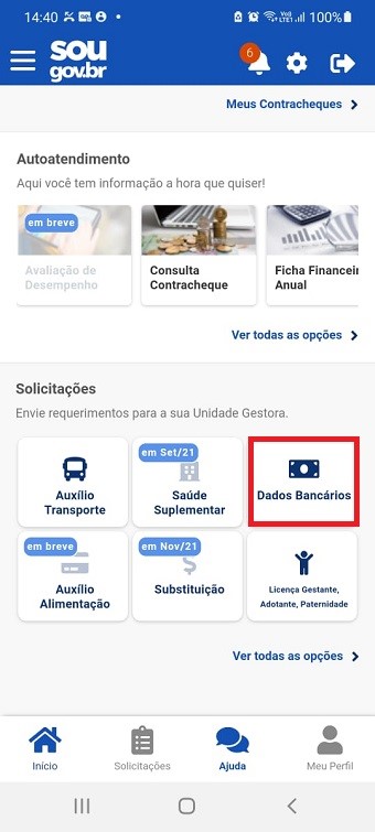 1º) Na tela inicial do SouGov, em Solicitações, clique em Dados Bancários: