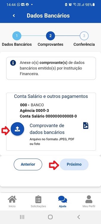 3º) Será necessário incluir o comprovante de dados bancários, que é exigido para avaliação da alteração de sua conta. Clique na seta para inserir uma imagem ou PDF e depois em Próximo.