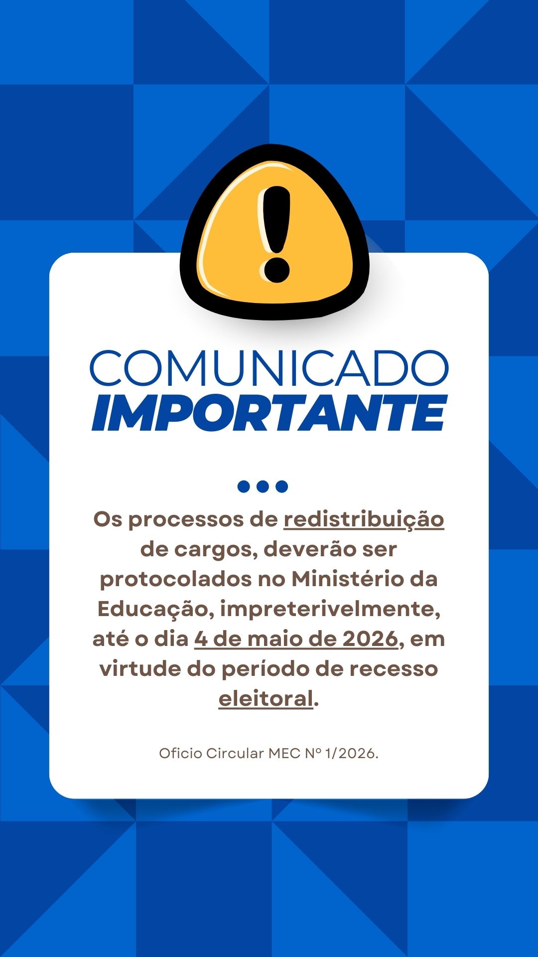 Os processos de redistribuição de cargos, deverão ser protocolados no Ministério da Educação, impreterivelmente, até o dia 4 de maio de 2026, em virtude do período de recesso eleitoral.